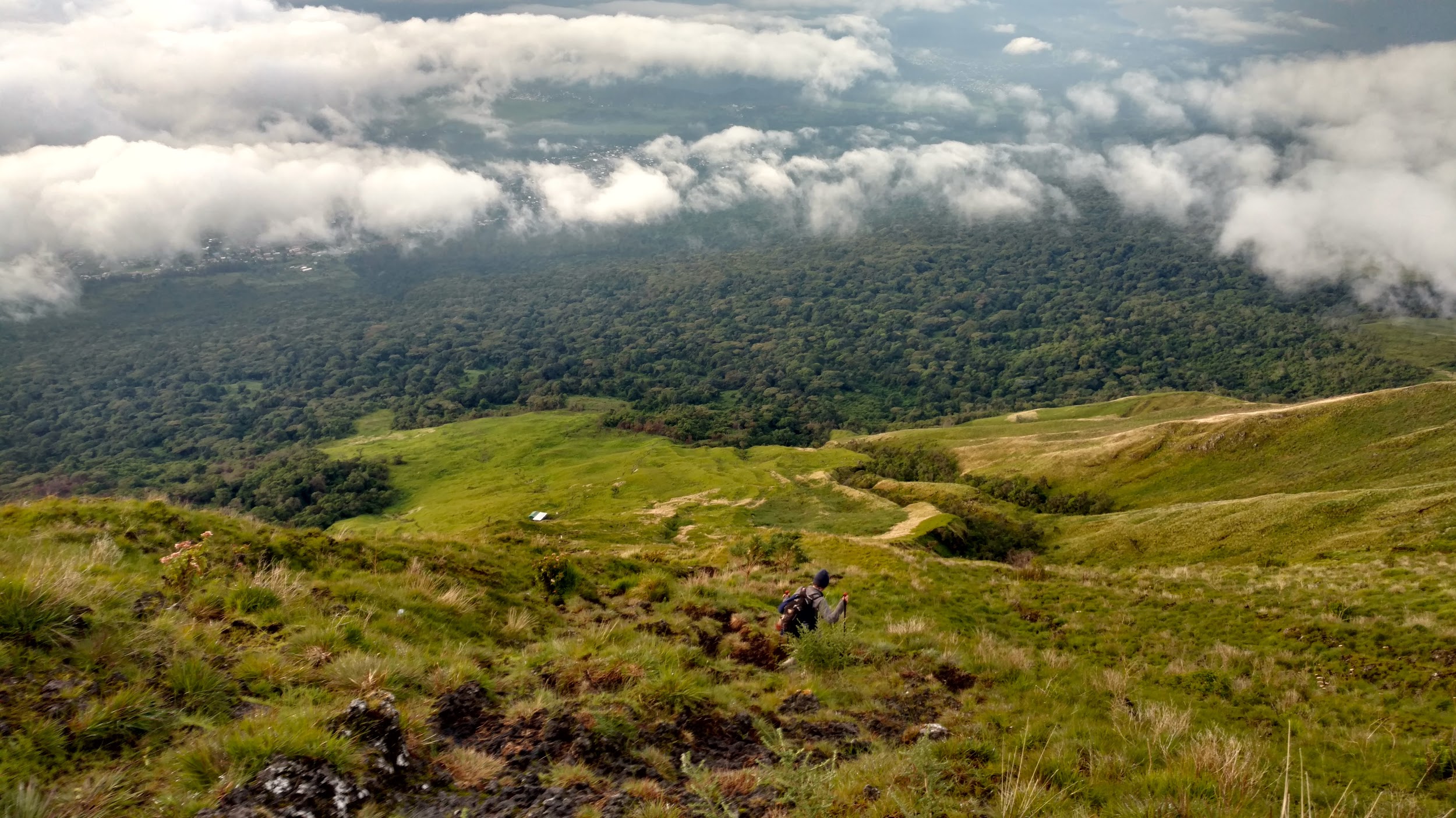 After we had warmed up around the fire, we set out once again so we could reach our destination before nightfall: intermediary hut. As we continued hiking, we suddenly broke out of the jungle and were able to see the steep face of the mountain ahead of us as it disappeared into the clouds.